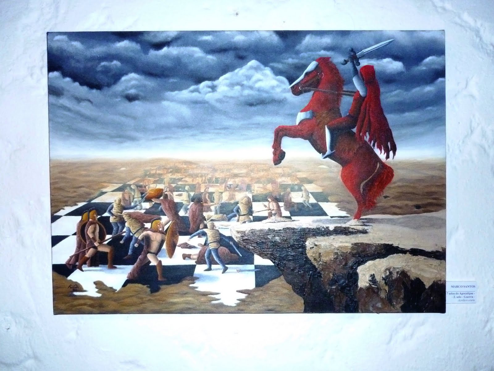 A evolução da pintura de Marco Santos define-se pela procura incessante da sua identidade artística, passando por diferentes estilos pictóricos é no Surrealismo e Arte fantástica onde se encontra a si próprio.É ai onde deixa fluir os seus pensamentos que estando presos , alguns pela censura do subconsciente saem em forma simbólica e confusa, uma maneira de ver o mundo que nos rodeia. Texto de Elena Ojea